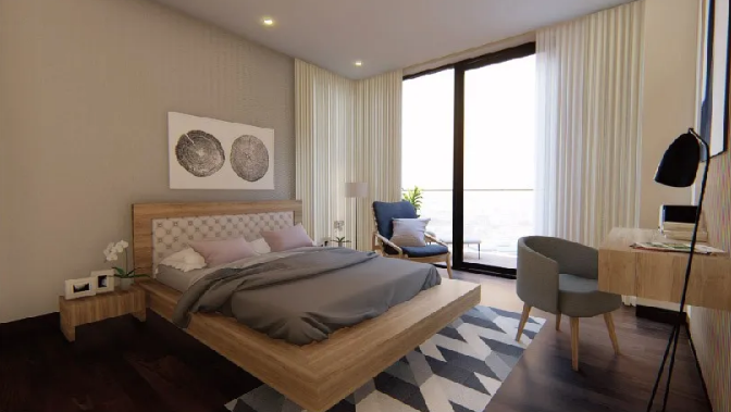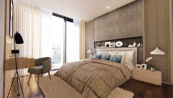 The bedroom's definition, just like "the oasis in the city".It is the best place for people to forget the hustle,bustle and relax. The bed of geometrical shape gives person a feeling to be met a bit hard, but fabric, white oak can have downy effect to the whole space. The master bedroom creates a nice balance of "simplicity and pleasure". Several armchairs are placed by the balcony window to create a leisure experience with beautiful scenery for employees.