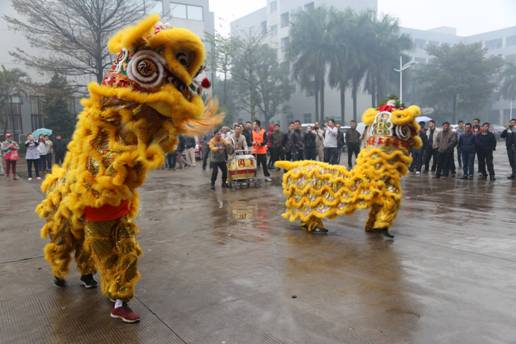 早上9:00,細(xì)雨霏霏。雅柏公司生產(chǎn)基地內(nèi)充滿歡聲笑語,鞭炮齊鳴,鑼鼓喧天,在寬敞的公司院內(nèi)一對醒獅憨態(tài)可愛,形神兼?zhèn)?。時而威風(fēng)凜凜,閃展騰挪;時而謙恭有禮,憨厚善良,逗人喜愛。起勢、常態(tài)、奮起、疑進(jìn)、抓癢、迎賓、施禮、驚躍、審視、酣睡、出洞、上臺取物等等,無不神似。巍巍醒獅帶給雅柏人新春的喜悅和新年的祝福!